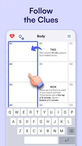 Each word game level consists of cells. One or more cells contain clues about the words hidden in other cells. Use logic to place the answers to the word riddles in the correct cells. Solve the word puzzle and complete all the word puzzle levels.