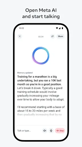 Buka aplikasi dan mulai bicara. Aplikasi Meta AI (sebelumnya aplikasi Meta View) didesain untuk percakapan timbal balik yang natural, agar Anda bisa mendapatkan apa yang Anda perlukan dengan lebih cepat dan mudah. Meta AI* dapat mempelajari preferensi dan minat Anda untuk memberi Anda jawaban yang lebih bermanfaat, baik saat Anda sedang bepergian atau untuk menyelesaikan pekerjaan. Meta AI juga dapat membantu Anda membuat, mengedit, atau mengubah gaya gambar dan video.