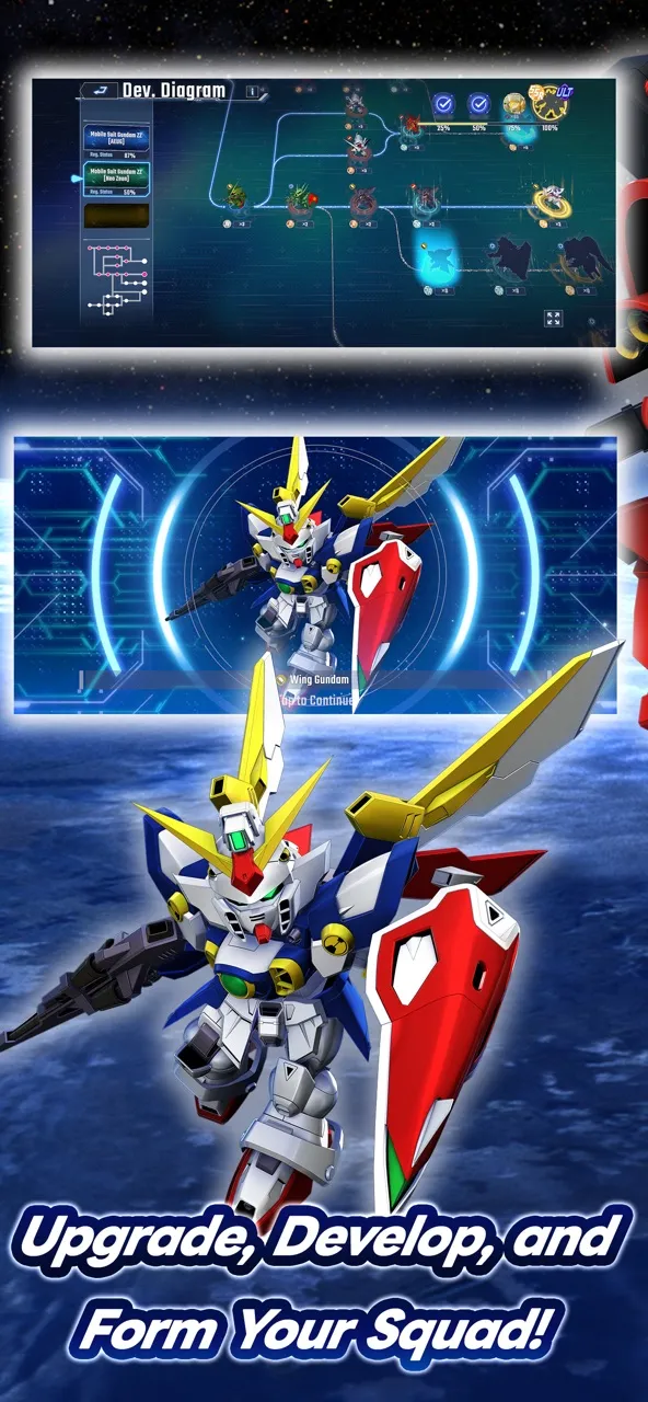 Dive into the world of Gundam and enjoy the game's unique system to upgrade, develop, and form squads with your favorite Mobile Suits and characters from your favorite series.