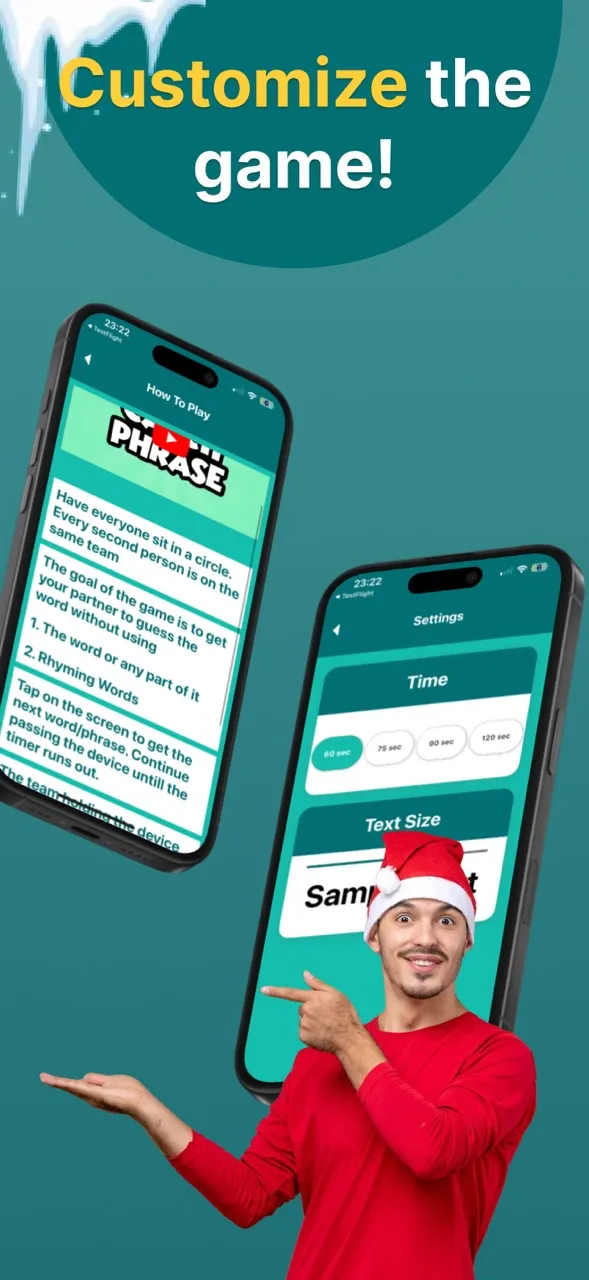 เริ่มปาร์ตี้กับ Hot Phrase — เกมคำศัพท์สุดมันส์สำหรับเพื่อน ครอบครัว และงานสังสรรค์สุดมันส์! แบ่งทีม ผลัดกันให้คำใบ้ และแข่งกับเวลาเพื่อให้เพื่อนร่วมทีมทายคำหรือวลีบนหน้าจอ ใช้ท่าทาง คำใบ้ที่ชาญฉลาด หรือวลีสั้นๆ — แต่ห้ามใช้คำคล้องจองหรืออักษรไขว้!