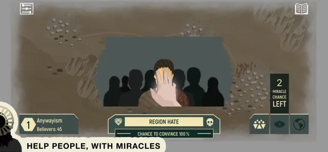 You can upgrade your religion to reach more people and improve yourself to perform miracles or cause calamities.