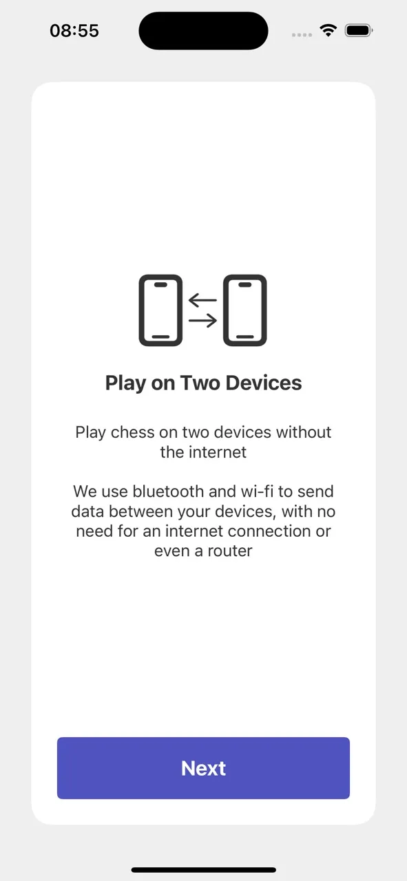 In "Two Device" mode, moves are sent between your devices using peer-to-peer data transfer. It's like playing online, but with no need for an internet connection or even a router. (Remember to keep your Bluetooth and Wi-Fi active for the data transfer to work).