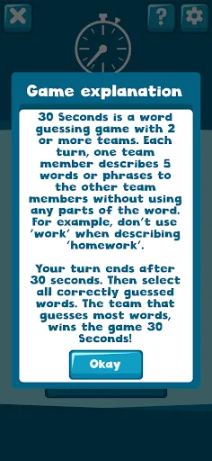 A game of "30 Seconds" is played with 2 or more teams. One team member tries to describe 5 words or phrases to the other team members within half a minute. Each correct word is awarded with one point. The team with the most points wins the game!